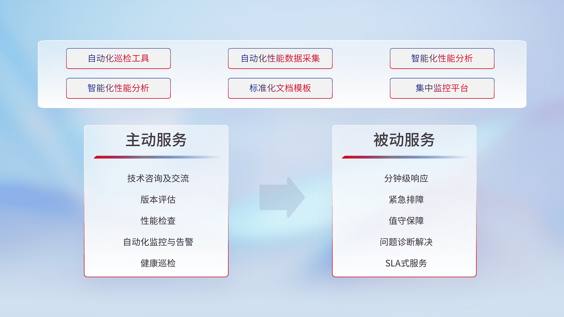 智能化工具和标准化文档,,,,保障服务质量,,,提供主动服务(包含技术咨询、、版本评估、、、性能检查、、、自动化监控与告警、、、健康巡检)和被动服务包含(分钟级响应、、、紧急排障、、值守保障、、问题诊断解决、、SLA服务)。。。