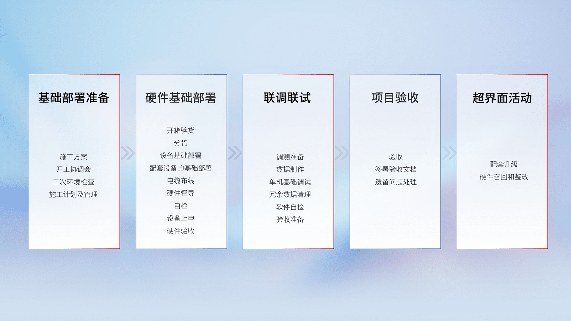 从基础部署准备、、、、硬件基础部署、、联调联试、、、、项目验收、、、越界面活动的全过程可追溯,,,,保证施工质量和进度。。